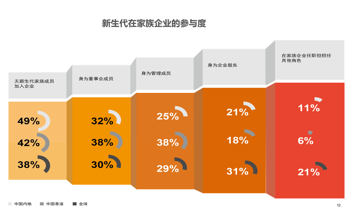 高达81%的中国内地受访者表示他们目前没有健全的、明文记载且清晰传达的继任计划,这一比例高于中国香港的80%和全球的70%。49%的内地受访者没有新生代参与企业运营,高于中国香港的42%和全球的38%的平均值。