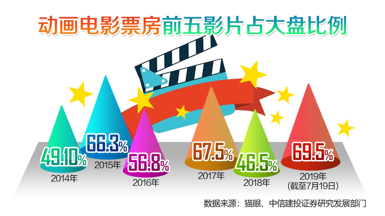 随着多个动画电影爆款的出现,头部动画影片集中了越来越多的票房,出现赢家通吃的局面。2014年以来,国内动画电影市场年度票房前三和前五的影片基本斩获了五六成的动画电影票房。以今年至今为例,即使剔除仍在上映的《哪吒》,年度动画电影票房前五的影片《熊出没:原始时代》《千与千寻》《狮子王》《白蛇:缘起》《驯龙高手3》也一共席卷了26.05亿元票房,占年内动画电影票房的69.5%。
