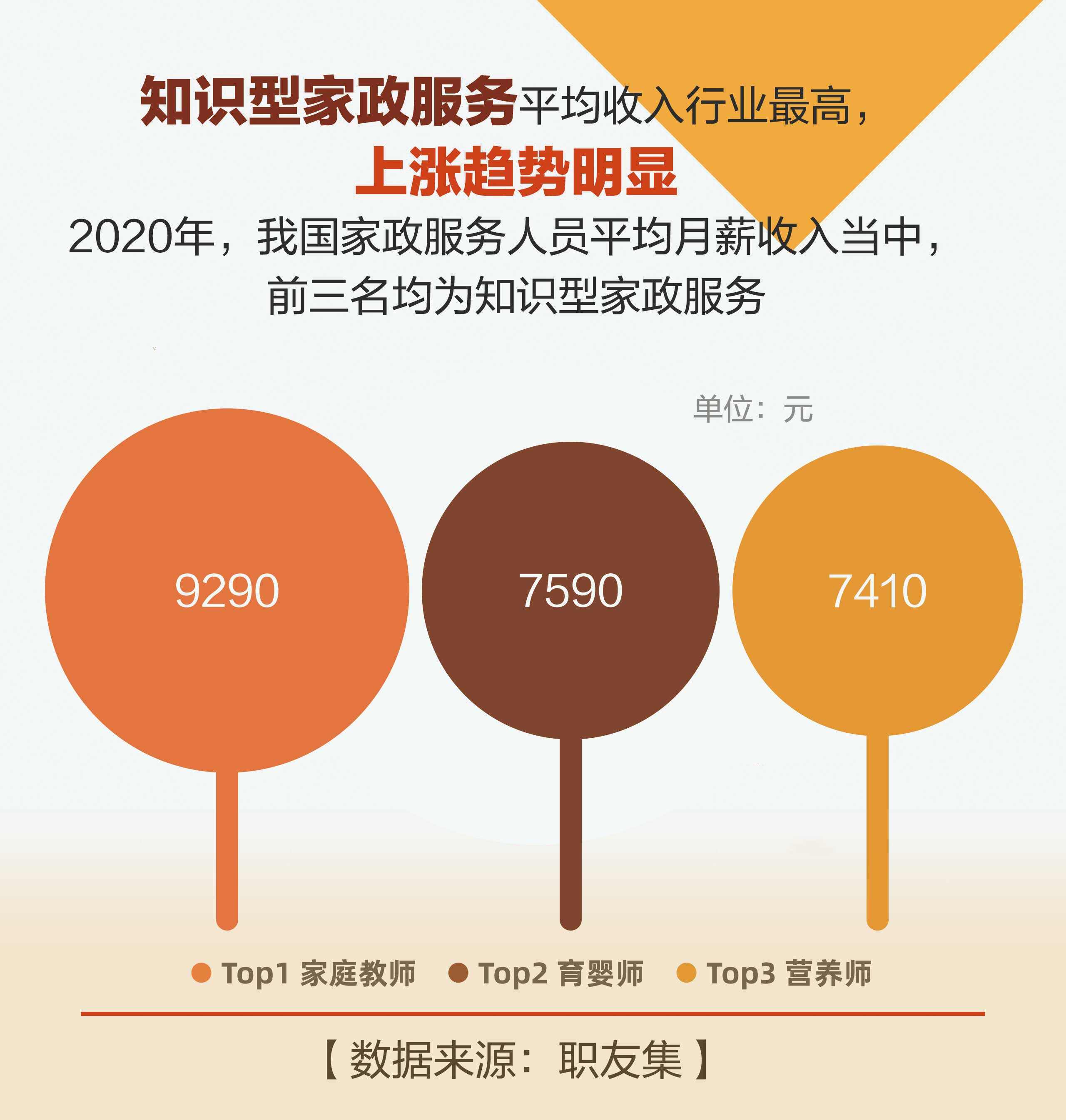 知识技能型市场规模的扩大的背后是市场对知识技能型家政服务人员的迫切需求。职友集调查结果显示,2020年,我国家政服务人员收入当中,前三名均为知识型家政服务,其中位列收入首位的家庭教师平均月薪高达9290元。相比之下,简单劳务市场家政服务人员薪资则差距较大,职业保姆平均月薪仅为5840元,保洁员收入仅3310元。