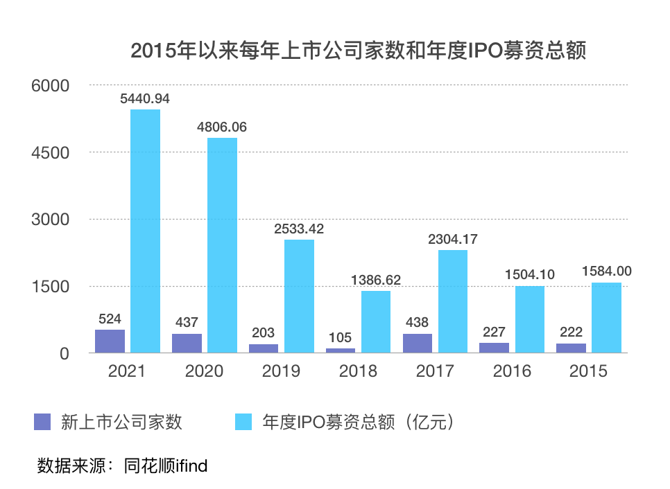 数据显示,截至去年12月31日,全年A股上市新股数量合计达524家,其中核准制下上市企业合计122家(沪市主板88家、深市主板34家),科创板、创业板上市企业分别为162家和199家,北交所上市企业41家。整体来看,2021年524家上市公司合计募资金额超过5400亿元,2021年IPO企业数量和募资金额分别同比增长了20%、13.21%。