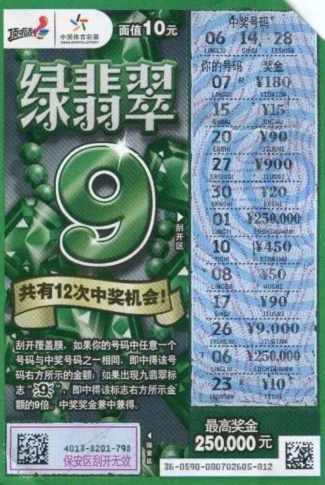 魅力绿翡翠,好运常相随。“绿翡翠”是顶呱刮的经典票种,面值10元,头奖25万元,共有12次中奖机会,自销售上市以来,广受购彩者的喜爱。继7月18日新鲜出炉的“绿翡翠”一等奖,仅隔一周,佛山再次中出“绿翡翠”一等奖。